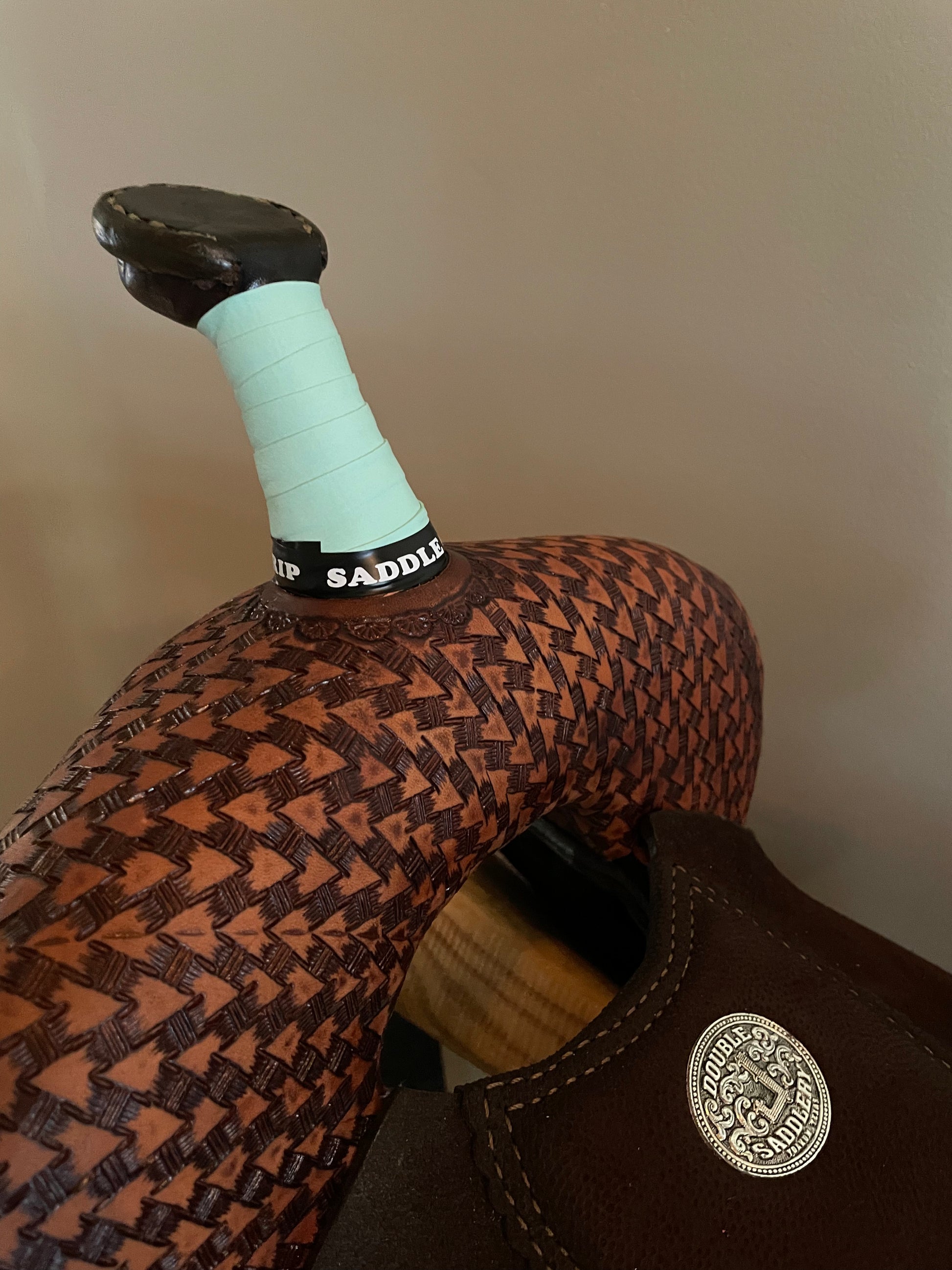 Chasin' Cans Mint Saddle Grip. Saddle Grip is a saddle horn overwrap that increases your grip, helps protect your horn, and adds a pop of color to your saddle.